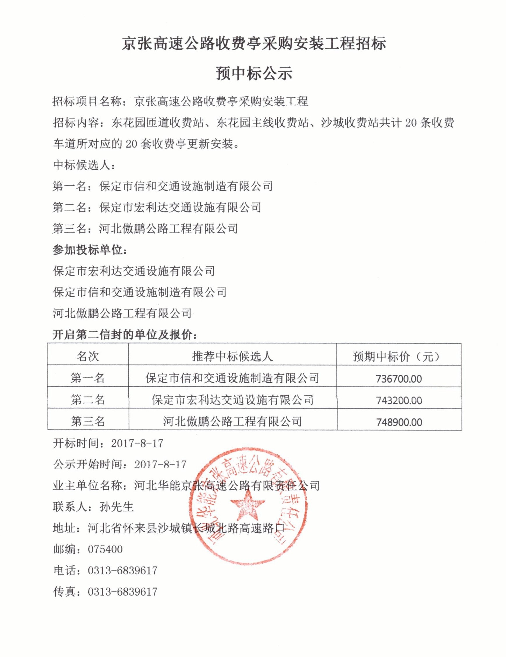 京張高速公路收費亭采購安裝工程招標預中標公示
